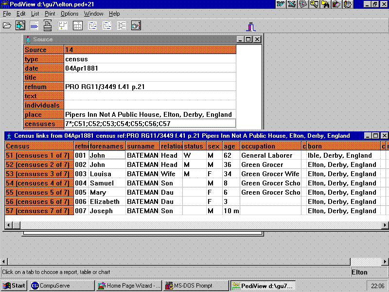 PediTree for Windows is now updating all types of Pedigree databases and has most of Pedigree's features. Its editing facilites, combined with GEDCOM import from RTF files converted from the LDS 1881 CD-ROM make the capture of sources and censuses independent of whether you decide to link some of the individuals to your Person and Marriage lineage records. See below.